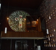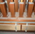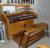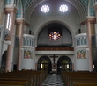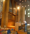 The main section faces the nave. The main section is behind the player and the chest section is in front of them. The pedal is on the right-hand side of the player, against the wall.